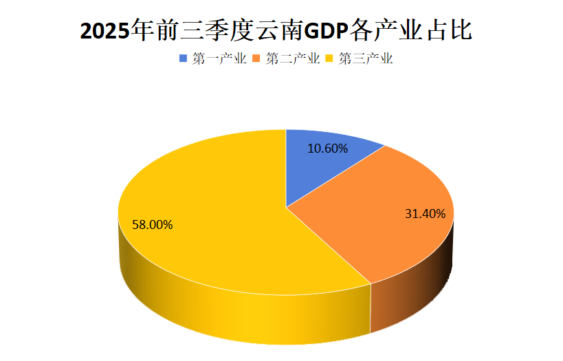 根据地区生产总值统一核算结果,云南省2025年前三季度实现地区生产总值(GDP)23518.47亿元,按不变价格计算,同比增长4.3%。分三次产业看,第一产业实现增加值2503.66亿元,增长2.8%;第二产业实现增加值7395.35亿元,增长3.2%;第三产业实现增加值13619.46亿元,增长5.2%。