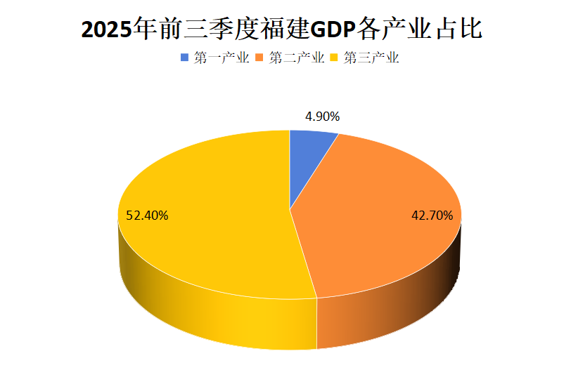 根据地区生产总值统一核算结果,福建省2025年前三季度地区生产总值(GDP)42339.86亿元,按可比价格计算,同比增长5.2%。其中,第一产业增加值为2089.78亿元,同比增长3.8%;第二产业增加值为18063.3亿元,增长5.4%;第三产业增加值为22186.78亿元,增长5.2%。