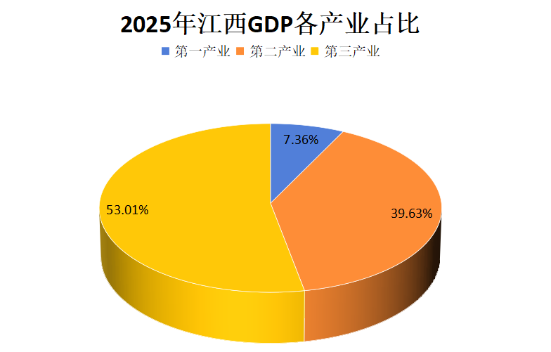 根据地区生产总值统一核算结果,江西省2025年地区生产总值36020.0亿元,按不变价格计算,同比增长5.2%。其中,第一产业增加值2649.9亿元,增长3.8%;第二产业增加值14274.5亿元,增长5.6%;第三产业增加值19095.6亿元,增长5.1%。
