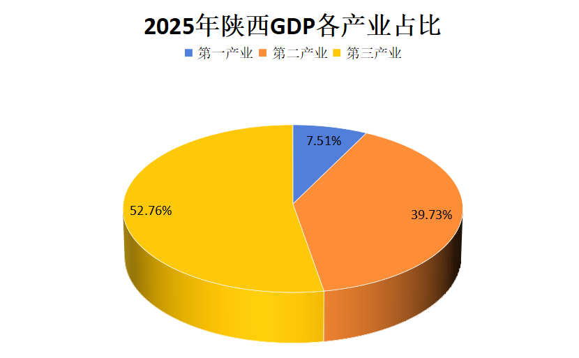 根据地区生产总值统一核算结果,陕西省2025年实现地区生产总值36551.10亿元,按不变价格计算,同比增长5.1%。分三次产业看,第一产业增加值2746.50亿元,同比增长3.8%;第二产业增加值14521.16亿元,增长5.6%;第三产业增加值19283.44亿元,增长4.9%。