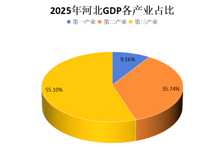 根据地区生产总值统一核算结果,河北省2025年地区生产总值49305.2亿元,按不变价格计算,比上年增长5.6%。分产业看,第一产业增加值4514.5亿元,增长3.4%;第二产业增加值17622.4亿元,增长5.4%;第三产业增加值27168.3亿元,增长6.1%。