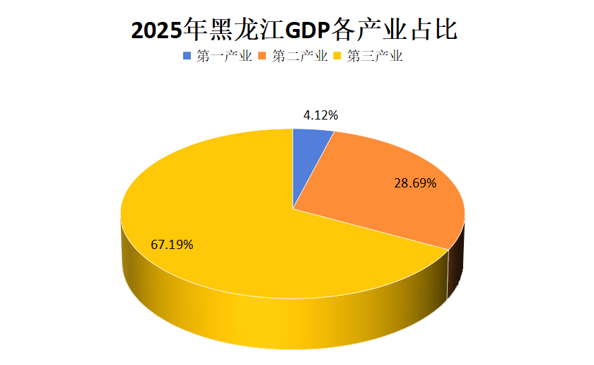 根据地区生产总值统一核算结果,黑龙江省2025年地区生产总值为16878.0亿元,按不变价格计算,同比增长4.2%。其中,第一产业增加值为3352.6亿元,同比增长3.5%;第二产业增加值为4008.8亿元,增长1.5%;第三产业增加值为9516.6亿元,增长5.5%。