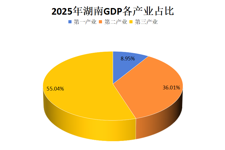根据地区生产总值统一核算结果,湖南省2025年地区生产总值55308.65亿元,按不变价格计算,同比增长4.8%。其中,第一产业增加值4951.76亿元、增长4.2%,第二产业增加值19915.46亿元、增长4.1%,第三产业增加值30441.43亿元、增长5.3%。