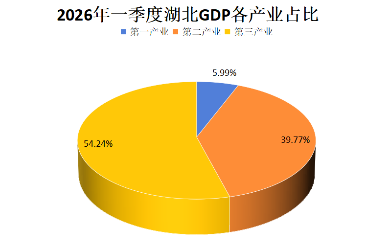 根据地区生产总值统一核算结果,湖北省2026年一季度实现生产总值14294.57亿元,按不变价格计算,同比增长5.4%。分产业看,第一产业增加值856.63亿元,增长3.9%;第二产业增加值5685.41亿元,增长5.9%;第三产业增加值7752.53亿元,增长5.1%。