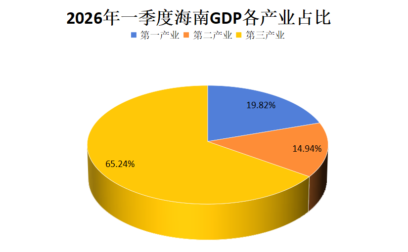 根据地区生产总值统一核算结果,海南省2026年一季度地区生产总值1979.94亿元,按不变价格计算,同比增长3.8%。分产业看,第一产业增加值392.48亿元,增长3.9%;第二产业增加值295.86亿元,增长2.2%;第三产业增加值1291.61亿元,增长4.1%。