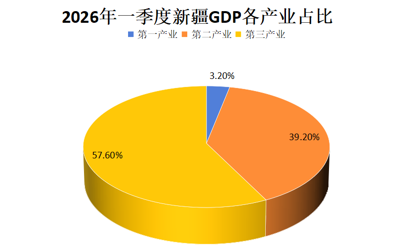 根据地区生产总值统一核算结果,新疆2026年一季度地区生产总值4826.26亿元,按不变价格计算,同比增长3.5%。其中:第一产业增加值154.54亿元,增长3.0%;第二产业增加值1891.64亿元,增长5.2%;第三产业增加值2780.08亿元,增长2.3%。