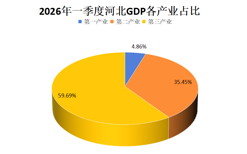 根据地区生产总值统一核算结果,河北省2026年一季度地区生产总值11748.3亿元,按不变价格计算,同比增长4.9%。分产业看,第一产业增加值571.3亿元,增长3.5%;第二产业增加值4164.6亿元,增长4.1%;第三产业增加值7012.3亿元,增长5.5%。
